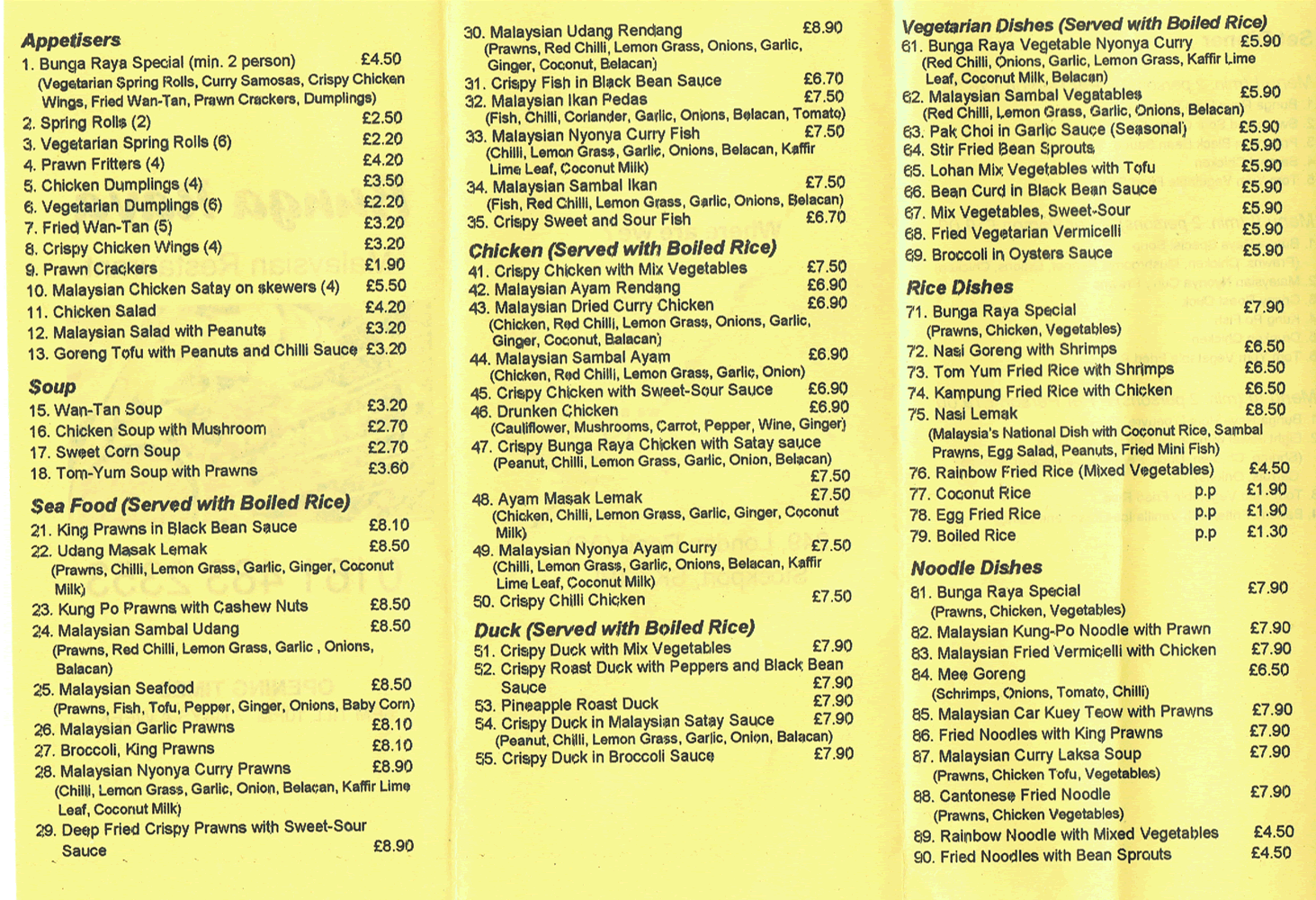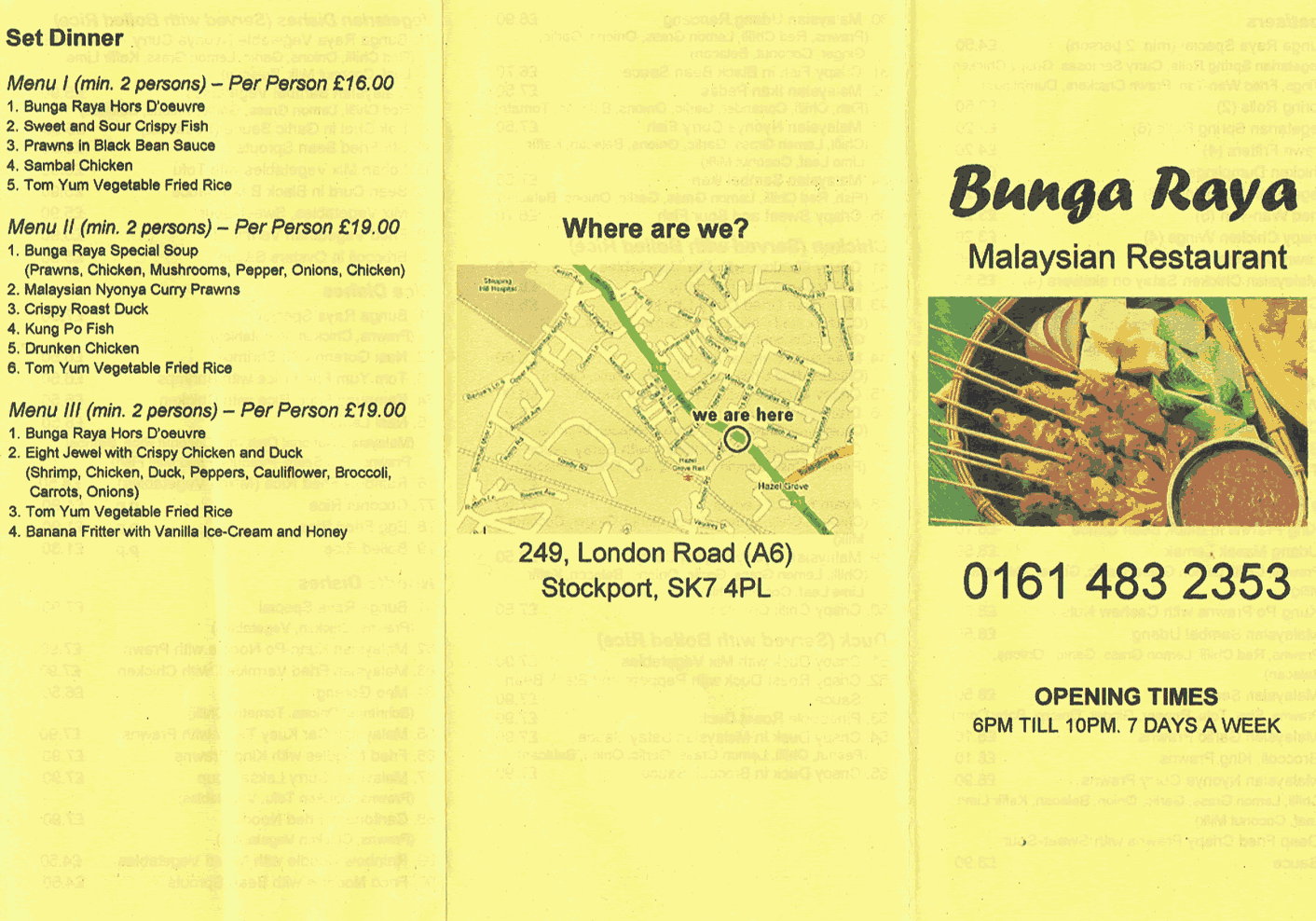 Visited the Bunga Raya for the first time last week and we are sure to be back again soon. This place is a little gem that seems to be hidden away despite its A6 location. I wanted to take my wife somewhere special for our wedding anniversary. She is from Malaysia and from our frequent visits there I too have become a big fan of Malaysian cooking especially from hawker street vendors. Something I have not had in the UK was an authentic Char kway teow (spellings differ from establishment to establishment)but that changed for me at the Bunga raya and for a moment I was back in Penang with an extra spicy version of the dish. Thank You. We also had some starters of chicken dumplings and chicken satay, and main courses of drunken chicken and crispy roast duck. All were fantastic, well prepared and very tasty. The service was great too. It is only a small place so best to book in advance but I can not recommend it highly enough. Full marks
