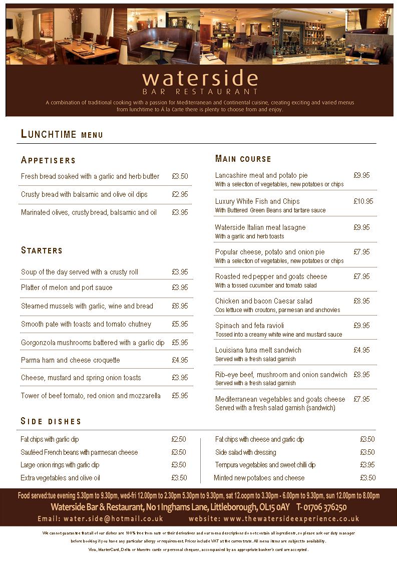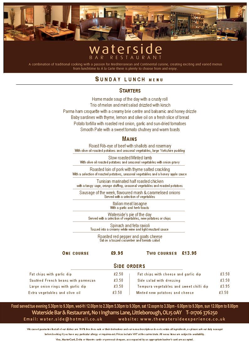 We have probably the best roast dinner available with a choice of the very popular Ribeye- Beef, Minted Lamb shoulder, Salted Crackling Pork and the Tunisian Lemon Chicken, all with trimmings and roasted fresh that day, these are roasts not to be missed along with other popular dishes like Lancashire's Meat & Potato Pie, Spinach & Feta Ravioli's and Waterside's Famous Cheese & Onion, Potato Pie