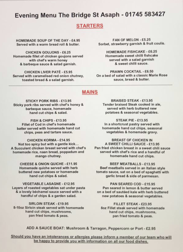 The menu has changed to Al a carte. Offering steaks, chicken and fish dishes as well as traditional meals including steak pie, braised steak, fish and chips and chefs homemade curry, sticky ribs, song with weekly specials. All the meals are prepared and made fresh onsite using as much local produce as possible.