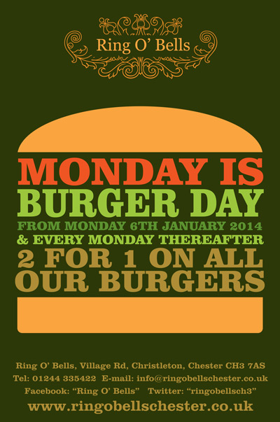 2 for 1 Burgers every Monday!